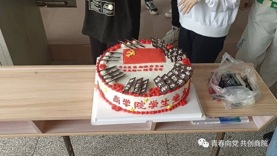 活动开始,全体人员肃立、奏唱国歌。随后,由商学院学生第二党支部书记杨丽梅老师致辞。她强调,希望各位年轻党员做到为党工作、不辱使命、勤奋敬业、扎实进取,努力在五个方面下功夫,即学习、珍惜、责任、勤奋、感恩。接着,商学院学生党员代表金筱妹上台发言,她表示无论在学习还是工作上,都要为广大群众作出表率,不断为党的伟大事业添砖加瓦。随后,由商学院党委副书记吴华军老师领誓,面对鲜红的党旗,全体党员高举右手,庄严宣誓。铿锵磅礴的誓词,强烈震撼着在场每一个人,一字一句,神圣而豪迈,激励着党员不忘初心、忠诚担当、践行使命、砥砺前行。最后,工作人员送上生日蛋糕,老师和在场学生党员一同拍照合影留念,记录下这珍贵的时刻。