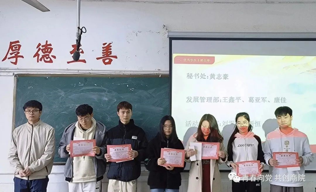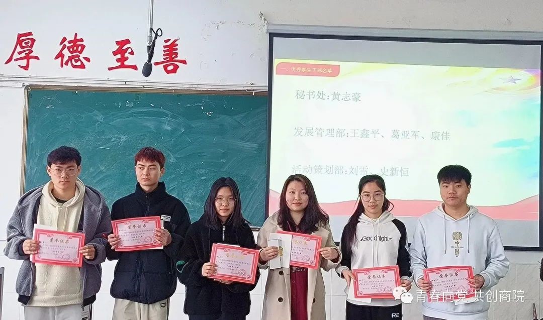 商学院学生党支部坚持每月对党务工作中工作表现优异的学生干部进行表彰,并为优秀学生党务工作者颁发获奖证书,以提高学生干部的工作热情。颁奖仪式中,商学院学生第二党支部副书记江志华宣读了本次优秀学生干部的名单,他们分别是秘书处干事黄志豪、发展管理部干事王鑫平、发展管理部干事葛亚军、发展管理部干事康佳、活动策划部干事刘雪、活动策划部干事史新恒。随后,江志华为此次获奖人员颁发荣誉证书及奖品,并在颁奖仪式结束后与获奖人员合影留念。