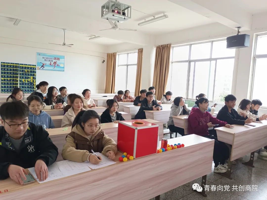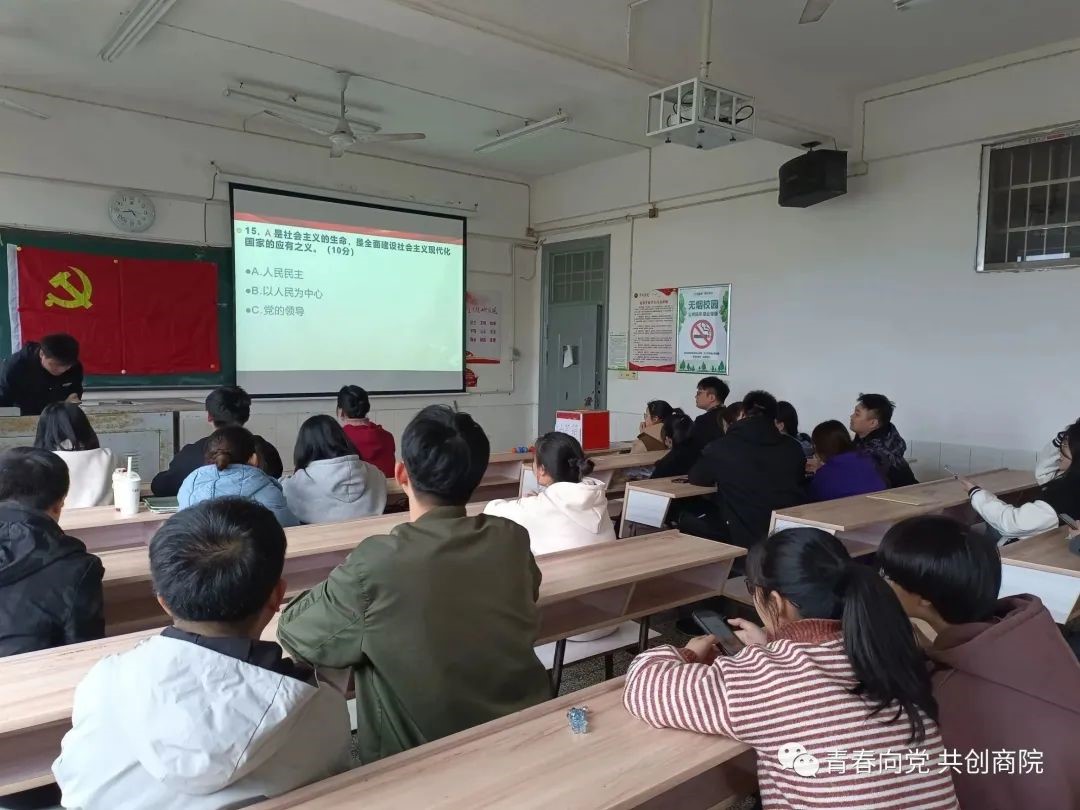 为积极响应党的号召,进一步营造学习贯彻落实党的二十大精神浓厚氛围,以党的二十大相关知识学习为抓手,通过答题竞赛的方式,激发我院学生党员和入党积极分子学习领悟党的二十大精神的要义和精髓的动力,以实践行动学习党的二十大精神。2023年3月26日16:30,商学院学生党支部在跬步楼1309教室开展了“学习贯彻二十大,扬帆起航新征程”知识竞赛活动。本次活动由活动策划部干事史新恒主持,商学院部分学生党员和入党积极分子参加。