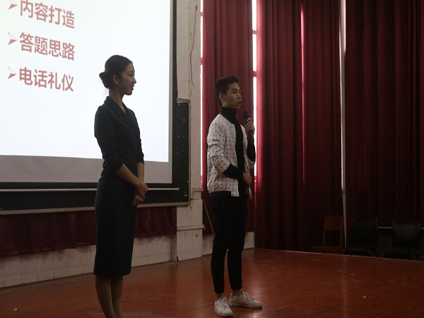 培训开始,活动负责人为此次培训活动致开场词,指出此次培训的目的在于增长大学生的礼仪知识,提升学生面试的精神面貌,具体培训分为引导手势、面部表情、蹲姿、坐姿及走姿等内容,彭欣老师指出:“想要成功的通过面试,给面试官留下的印象非常重要。”并传授一些基本面试技巧给同学们。培训过程中,彭欣老师展示出了优秀的专业素养,从基本礼仪开始:进门的第一刻,说的第一句话,第一个动作……并且,老师还邀请台下的学生一起互动,不仅如此,朱艳清老师还主动上台参于互动,提高同学们对活动的积极性。培训结束后,同学们表示学到了很多实用的礼仪知识,对于提高自身素养,对以后进行面试是有非常重要的意义。